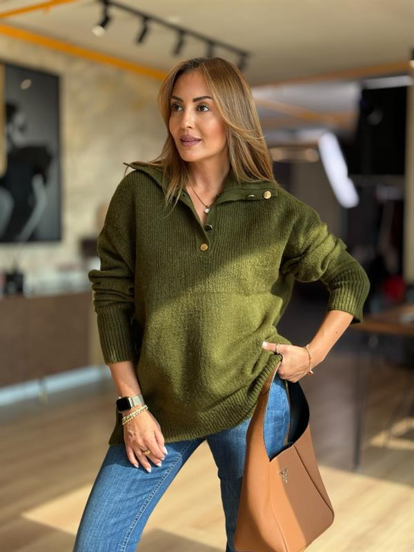 Büyük Yaka Gold Çıtçıt Detay Yeşil Kazak