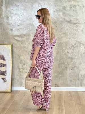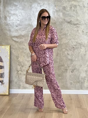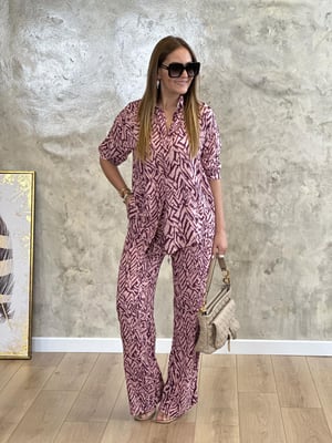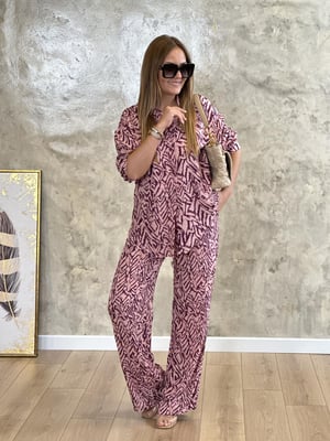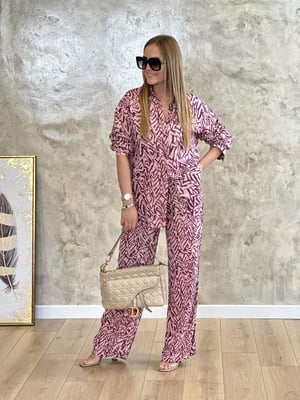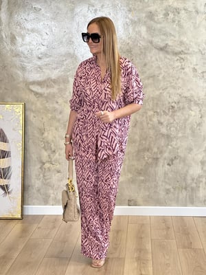 İkili takımımız rengi çok güzel pembe lila ve mor karışımlı çok güzel bir takım. Akışkan bir kumaşı var. Şiddetle tavsiye ettiğim ürünleri arasında. Ön kısmı komple düğmeli iki ayrı şekilde de kombin yapılabilir. Pantolonu ayrı gömleğini ayrı kullanabilirsiniz. Kollarımız tam koldur uzun kolludur. Kıvırarak kullanıma müsaittir. Bel kısmı yüksek bel, beli lastikli iki yanımız cep detaylı paçalarımız inanılmaz rahat ve akışkan üzerinize yapışmayan harika bir takım. Yine isterseniz önden bağlayarak da gömlek gibi kullanabilirsiniz. Small medium ve Large bedenlerde mevcuttur sınırlı sayıdadır.