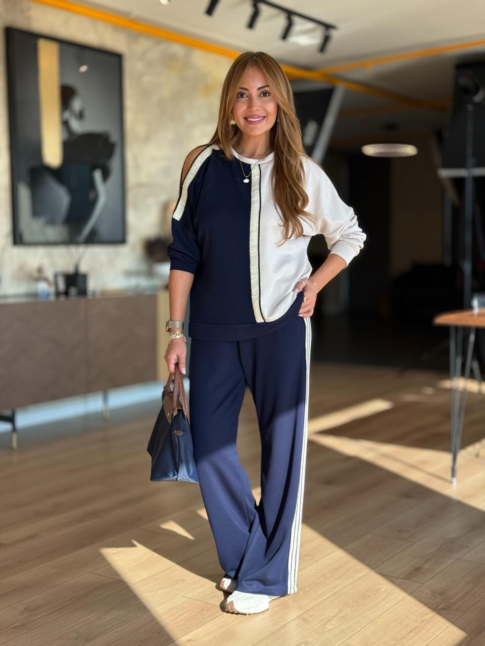 Omuz Dekolteli Ekru Lacivert Modal İkili Takım