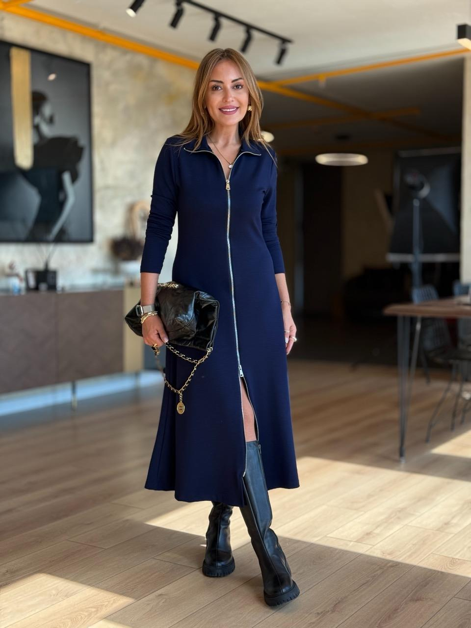 Önden Fermuarlı Yakalı Lacivert Modal Elbise