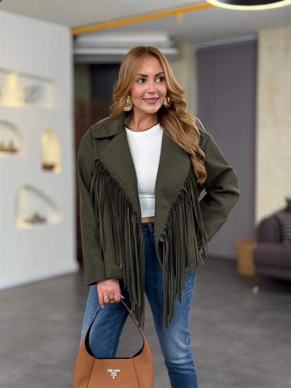 Tasarım Püsküllü Büyük Yaka Haki Kaşe Ceket
