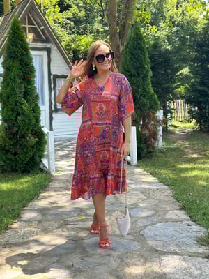 Aynı elbisemizin çok güzel bir deseni patchwork desen diyoruz buna inanılmaz güzel pamuklu viskon kumaş dokusu ile satıştadır. V yakası muazzam kollarımız çok güzel rahat ve geniş alt kısmı zaten volanlıdır. Midi boy elbisemiz tiril tiril pamuklu viskon dokuda. Yazın gerçekten çok rahat edebileceğiniz bir üründür. Arkasında bir bağcık detayımız var. Hafif sıkıştırarak kullanabilirsiniz, isterseniz salaş bırakıp da kullanabilirsiniz. Elbisenin genişliği çok güzeldir. Büyük bedenlerimiz de çok rahatlıkla bu elbiseyi tercih edebilir. Bu elbisemizde bir iki üç ve dört bedenlerimiz mevcuttur. 4 beden olan elbisemizi rahatlıkla 44 46 hatta 48 bedenler tercih edebilir. Sipariş vermeden önce ölçü isteyin.